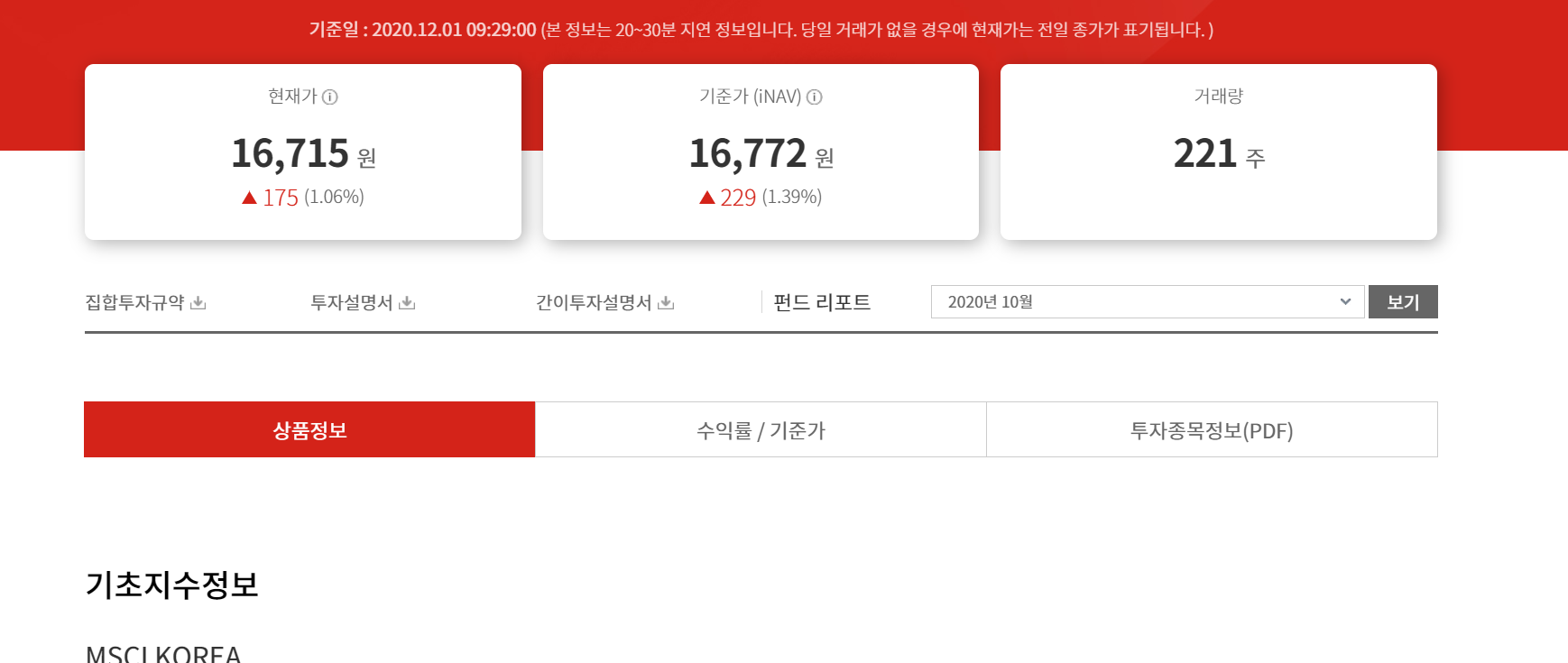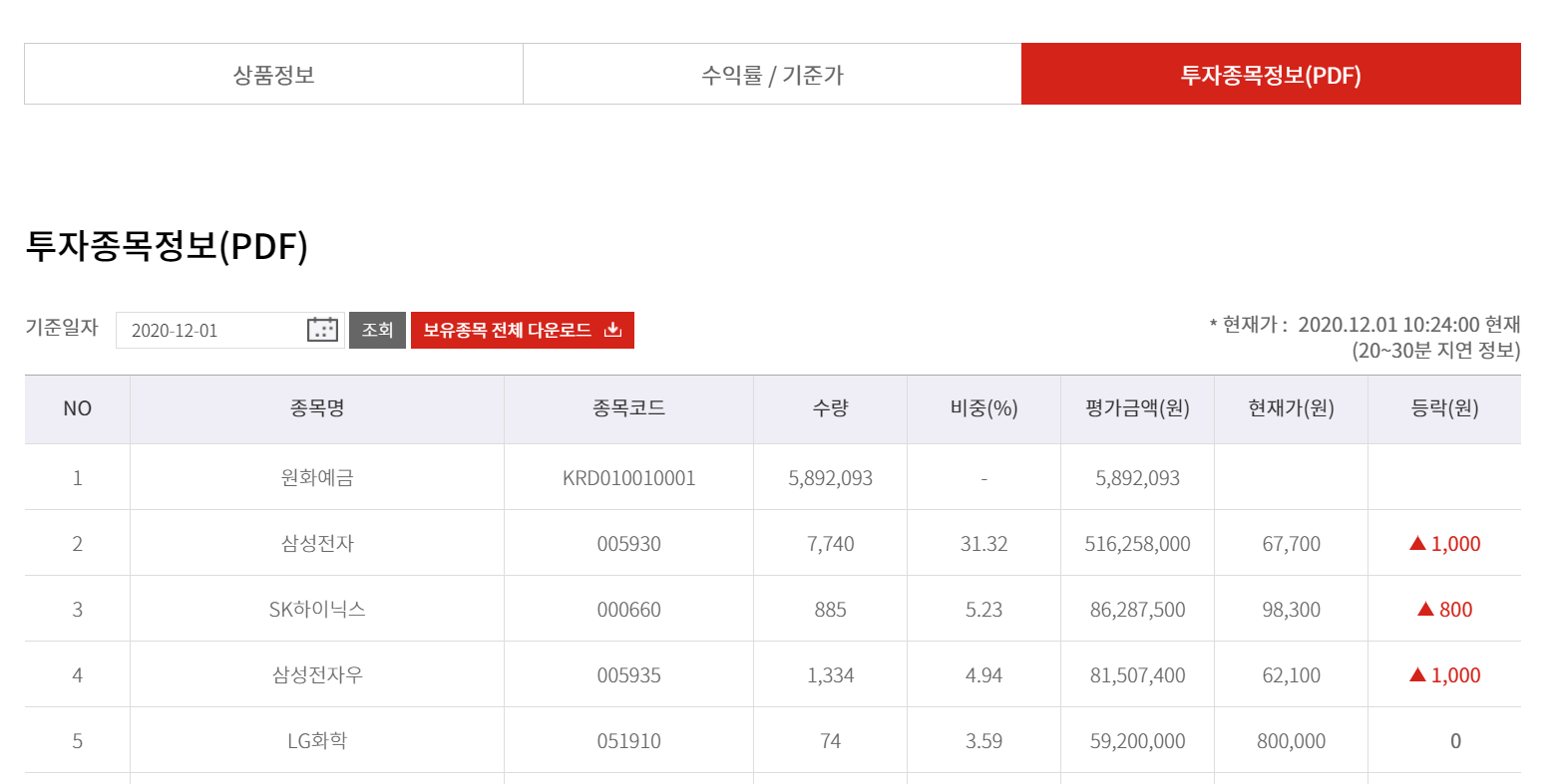 2. 웹사이트의 중간을 보시면 상품정보/ 수익률 기준가 / 투자종목정보(pdf) 버튼이 있음.