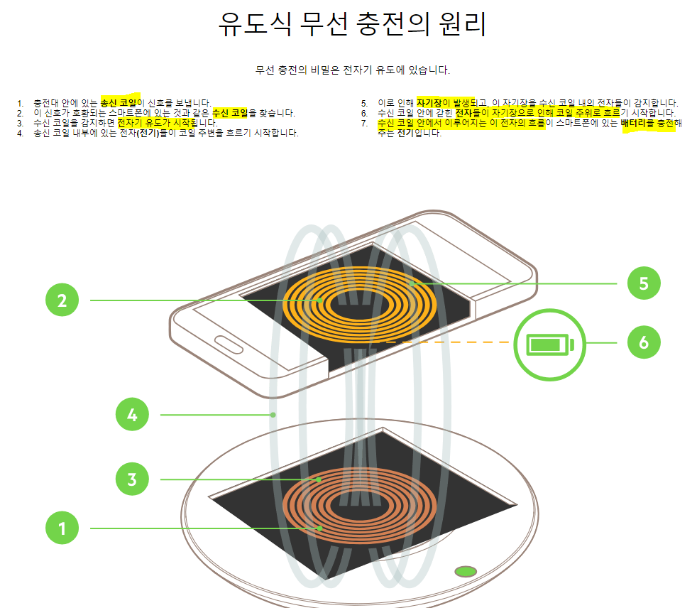 무선충전패드무선충전 패드 안의 코일(송신 코일)에 전류를 흘려보내면 자기장이 형성된다. 무선충전 패드에 형성된 자기장은 충전할 휴대폰 안에 내장된 코일에 전기를 유도한다.