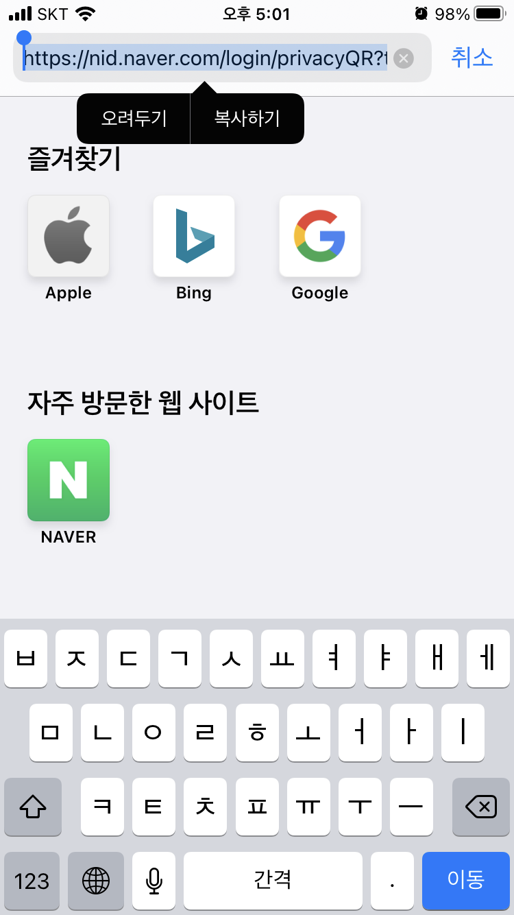 URL추가를 위해서는 네이버 앱으로 접속하면 안 되고, 사파리 브라우저로 네이버에 접속해야 합니다.