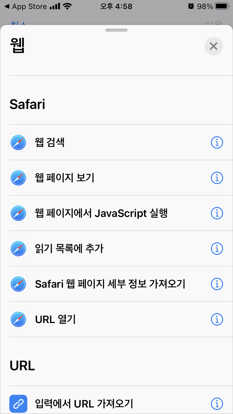 쭉쭉 내려서 사파리 URL 목록에서 URL열기를 누릅니다.