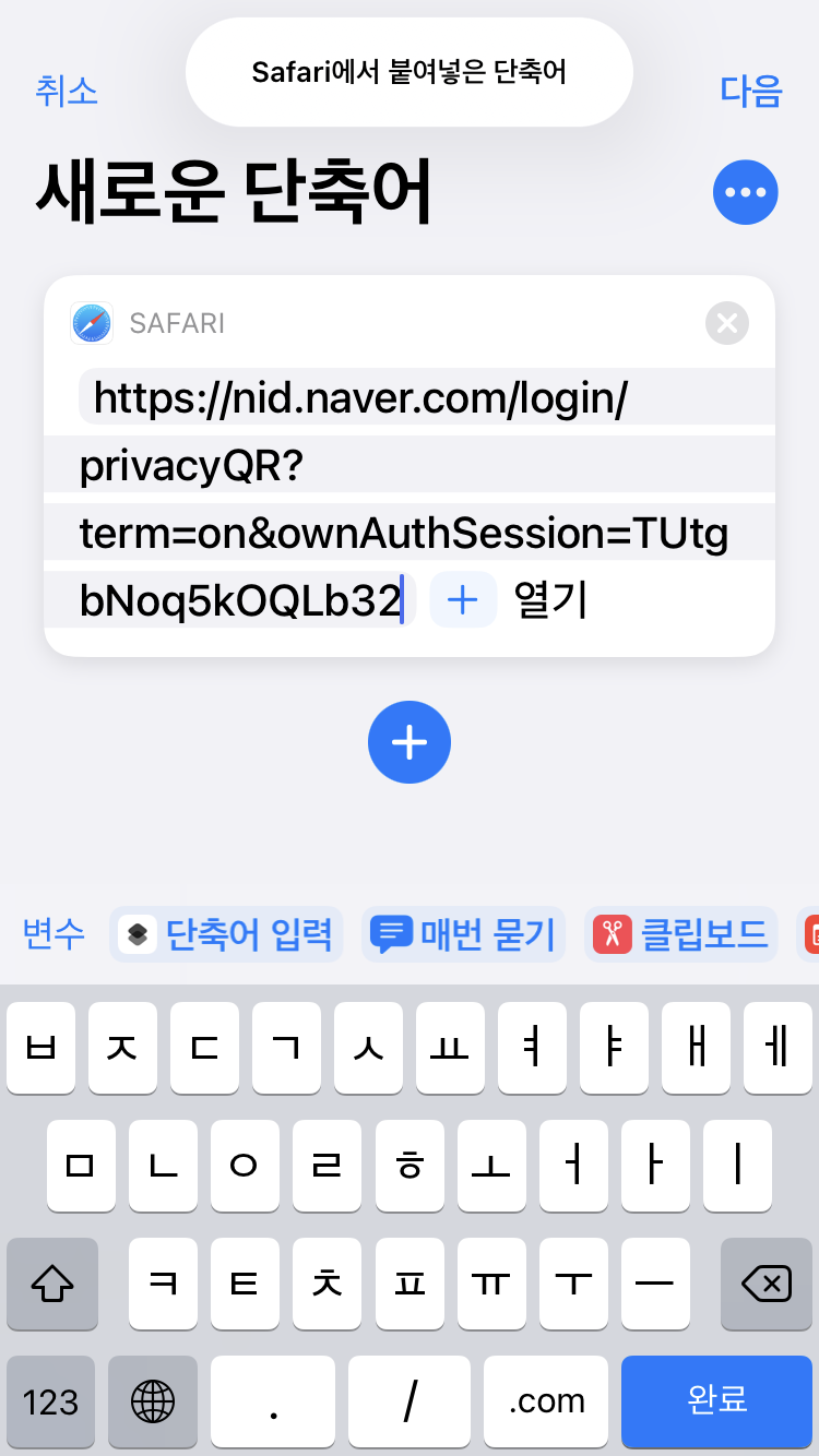 복사한 URL을 단축어 만들기 화면에 붙여 넣기 합니다.