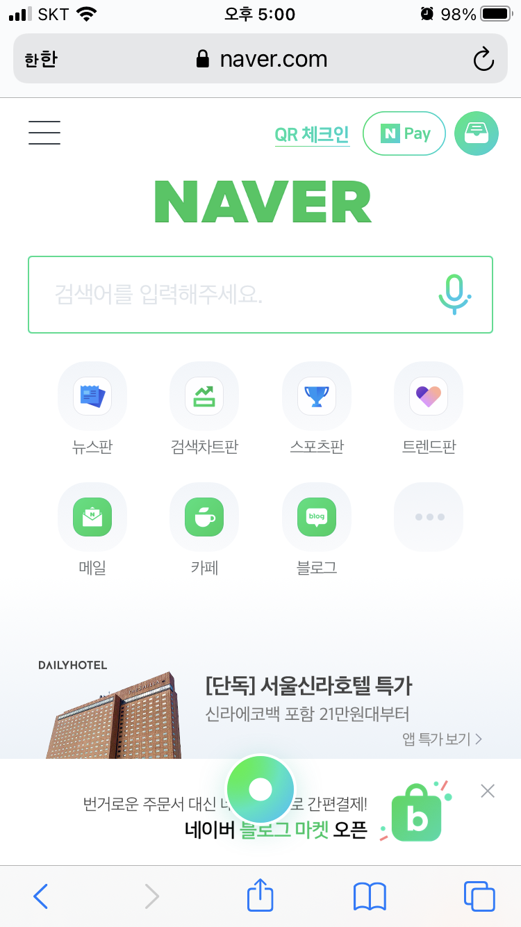 URL을 가져오기 위해서 홈으로 가서 사파리를 누르고 네이버 홈페이지로 갑니다.