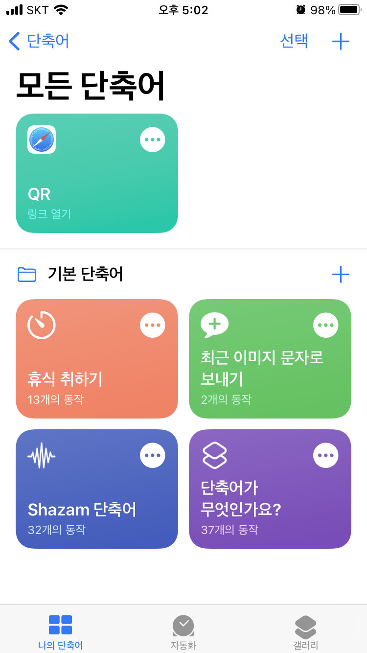 이중 탭 클릭, 제일 밑에 우리가 만들었던 QR 단축어가 있습니다.
