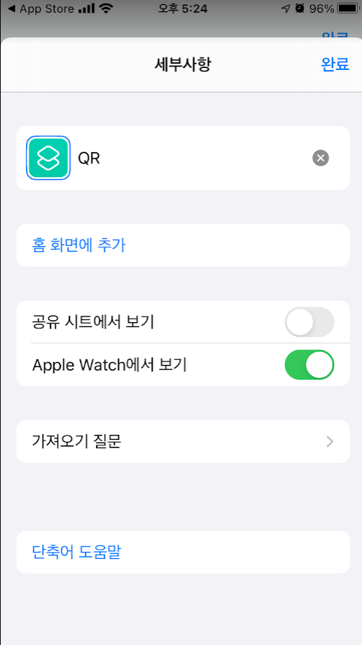 단축어로 들어가서, 옵션을 켜면 Apple Watch에서 보기 옵션이 있습니다. 활성화하고, 워치에서 단축어 메뉴로 들어가서 QR이라는 단축어를 클릭하면 네이버 QR코드 화면이 나타납니다. 다만, 최초에는 비밀번호를 입력해야 하는데, 애플 워치를 통해 문자 인식으로 아이디와 비밀번호를 입력하다 보니, 많이 귀찮습니다. 저는 패스했습니다.