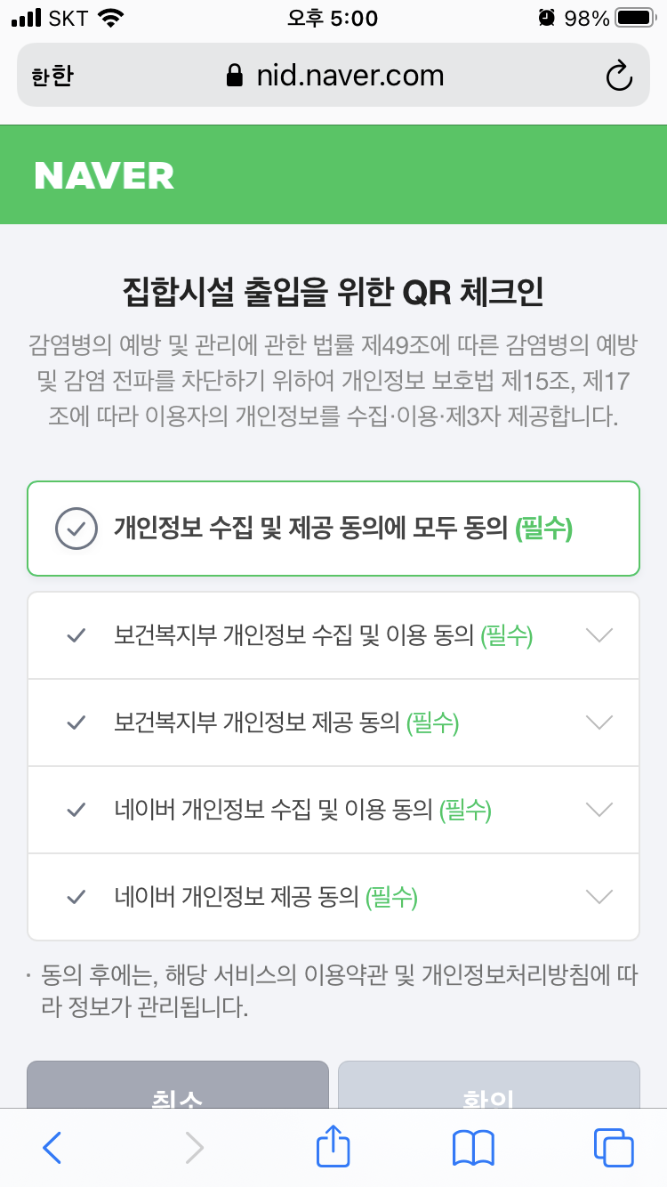 로그인 후 가운데 상단의 QR체크인을 클릭합니다. 약관 동의 및 휴대폰 인증을 합니다.