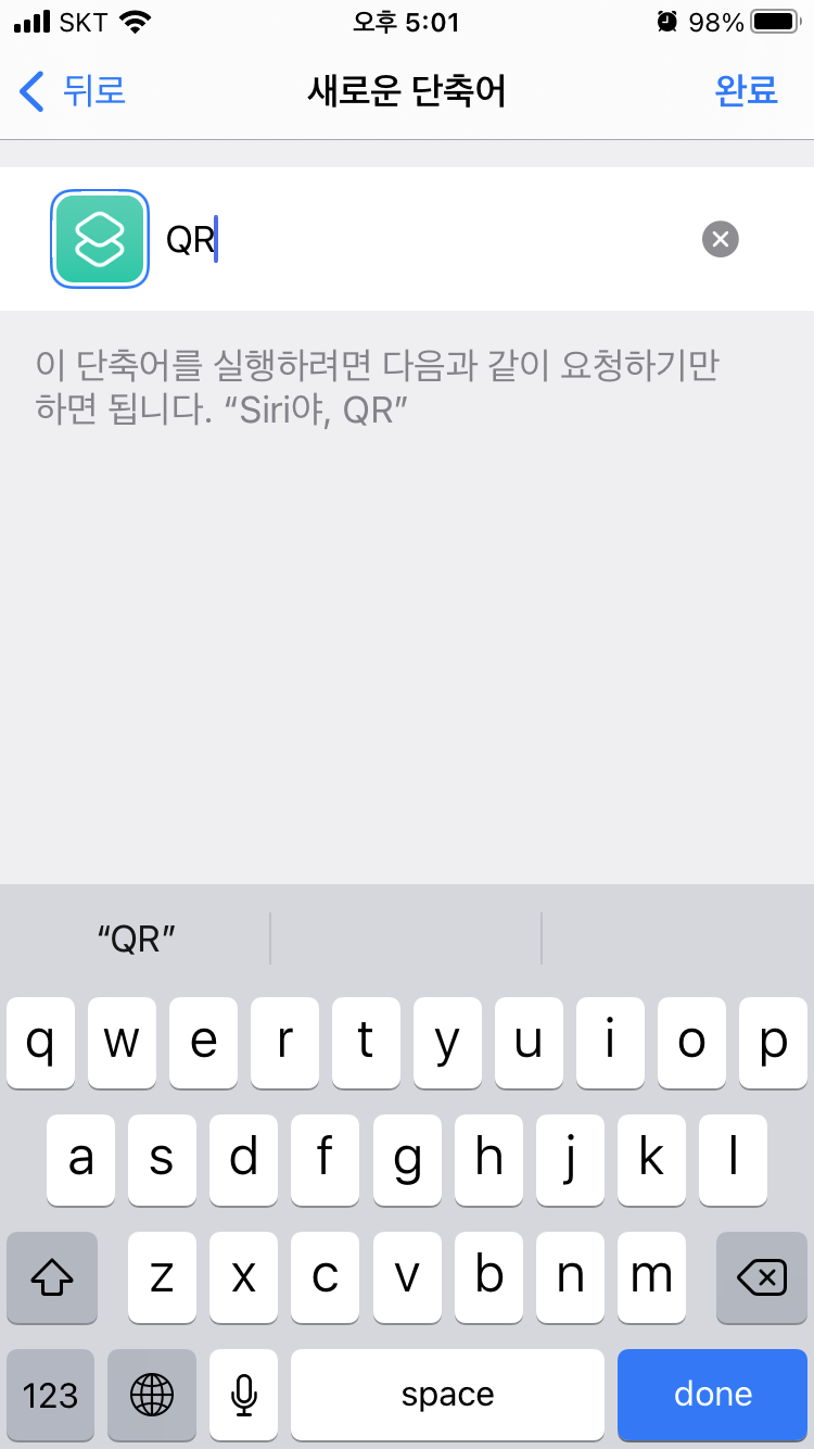 이후 해당 단축어 명령의 이름을 설정합니다. 저는 QR이라고 명명했습니다.