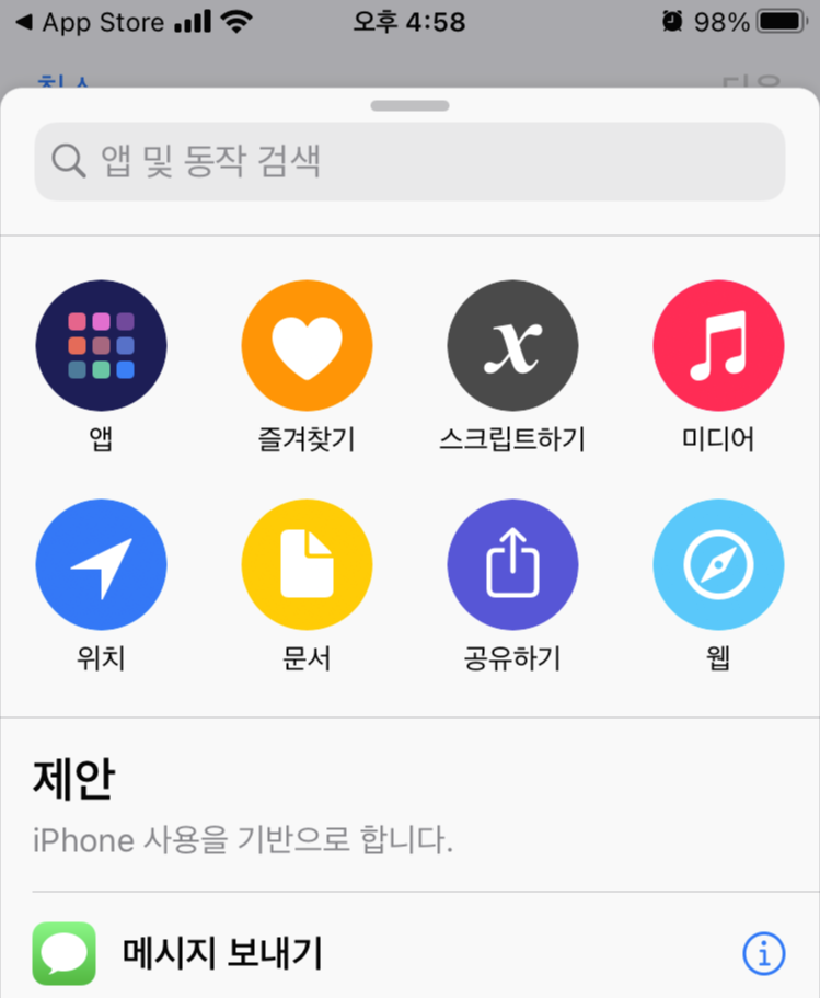 이제 앞에서 만든 단축어를 손쉽게 불러오기 설정을 할 차례입니다.