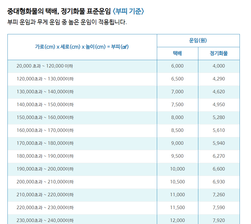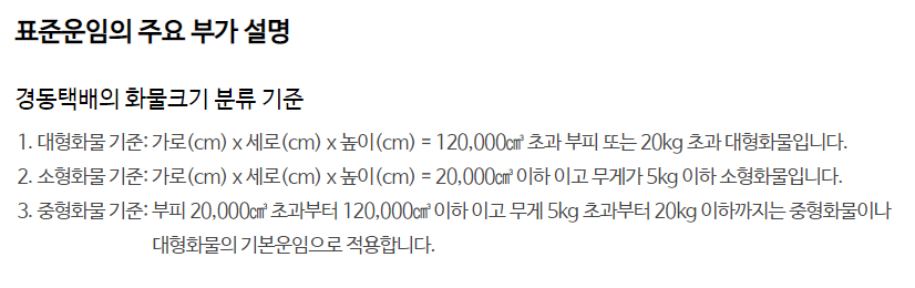 대형화물 기준은 가로*세로*높이 = 120,000제곱미터 초과 또는 20kg 중량 초과 시 대형화물로 분류되네요.