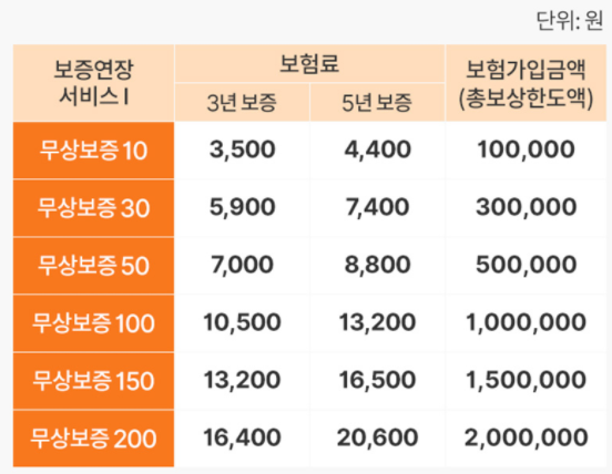 무상 보증 100: 100만원 보상한도, 3년/5년 보증